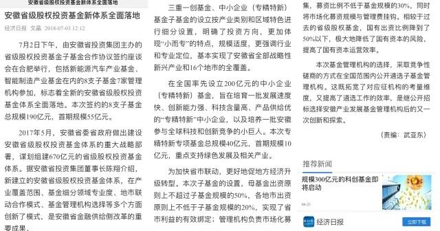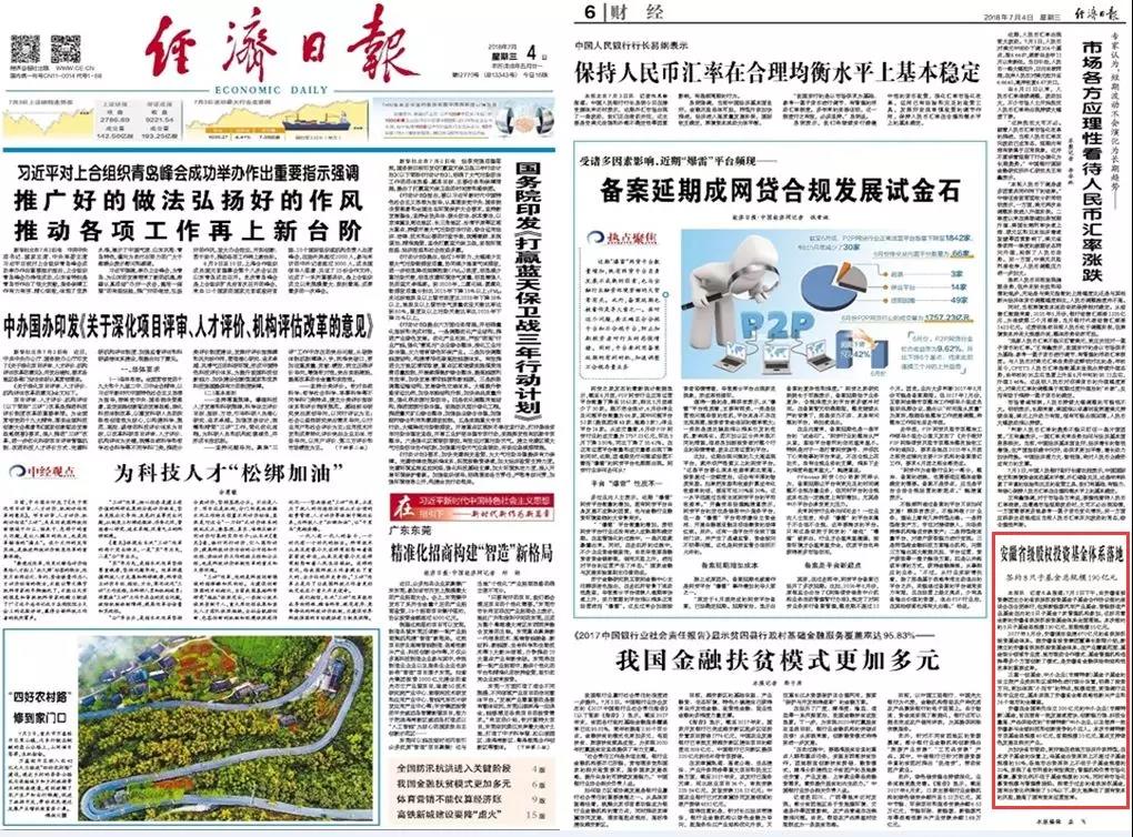7月4日的《经济日报》第6版刊发题为《安徽省级股权投资基金体系全面落地》的新闻报道。