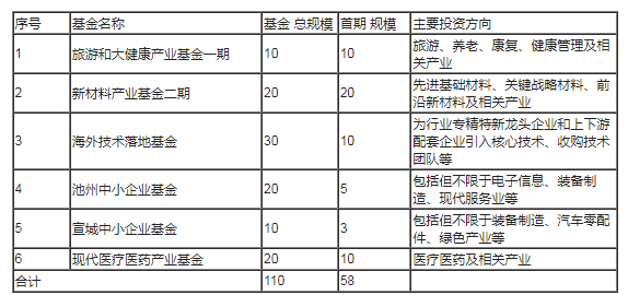 本次拟市场化遴选管理机构的专项基金共6支,包括:旅游和大健康产业基金一期、新材料产业基金二期、现代医疗医药产业基金、海外技术落地基金、池州中小企业基金、宣城中小企业基金。各专项基金按基金总规模一次性遴选管理机构,其中现代医疗医药产业基金、海外技术落地基金、池州中小企业基金、宣城中小企业基金分四期设立,旅游和大健康产业基金一期、新材料产业基金二期一次性设立。各专项基金规模及主要投资方向如下: